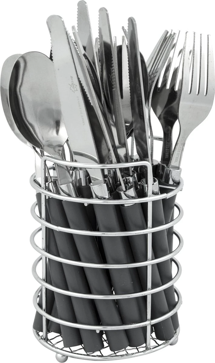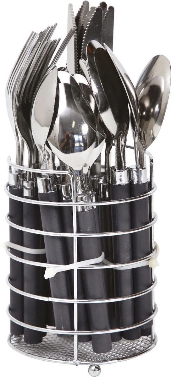 Een stevige 24-delige bestekset in een mandje. Deze praktische set is geschikt voor 6 personen en bestaat uit 6 messen, 6 vorken, 6 lepels en 6 kleine (thee) lepeltjes. Gemaakt van roestvrij staal met een kunststof heft en de set heeft hierdoor een lange levensduur.