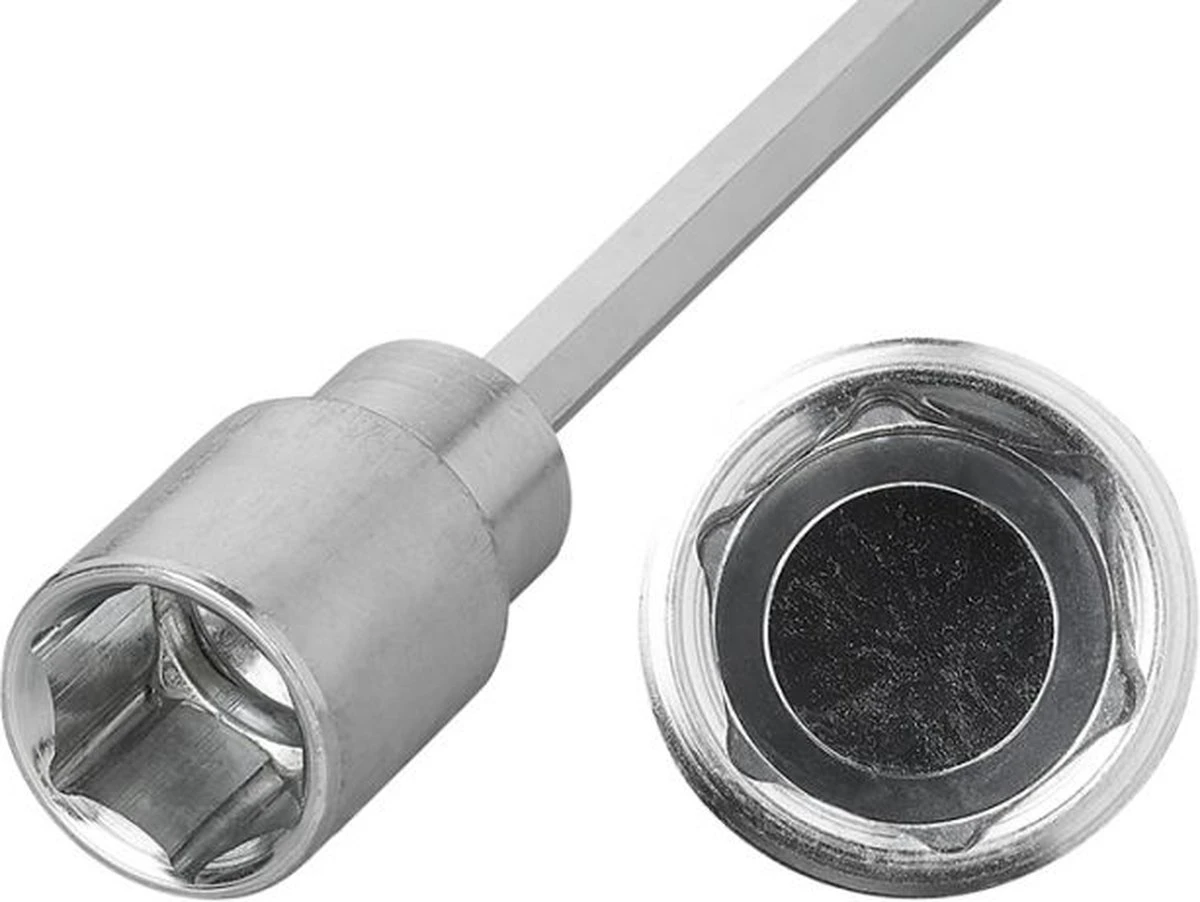 Een pootuitdraaisleutel is te gebruiken op een accuboormachine. Hiermee draai je makkelijk en eenvoudig de uitdraaisteunen omhoog of omlaag.