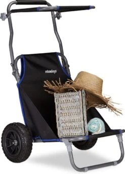 Voor de weg van het strand naar huis gebruik je de ligstoel als transportwagen. Hiervoor hoef je enkel de voorste steun omklappen. Met de gepolsterde handgrepen kun je nu de beach trolley comfortabel trekken en eenvoudig handdoeken, zwemkleding etc. vervoeren. Dankzij de brede wielen van rubber kun je gemakkelijk door het zand rijden. Doordat ze van rubber zijn, hoef je niet bang te zijn dat de banden leeg lopen.