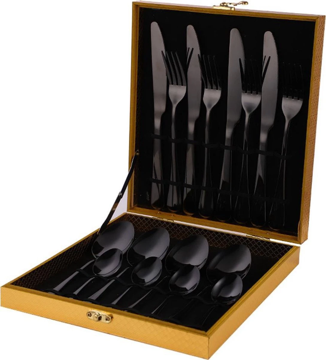 Ben jij op zoek naar een volledige, roestvrijstalen bestekset voor 4 personen? Deze bestekset, bestaande uit 4 messen, 4 vorken, 4 soeplepels en 4 teelepels wordt geleverd in een gemakkelijk te vervoeren luxe goudkleurige houten koffer.